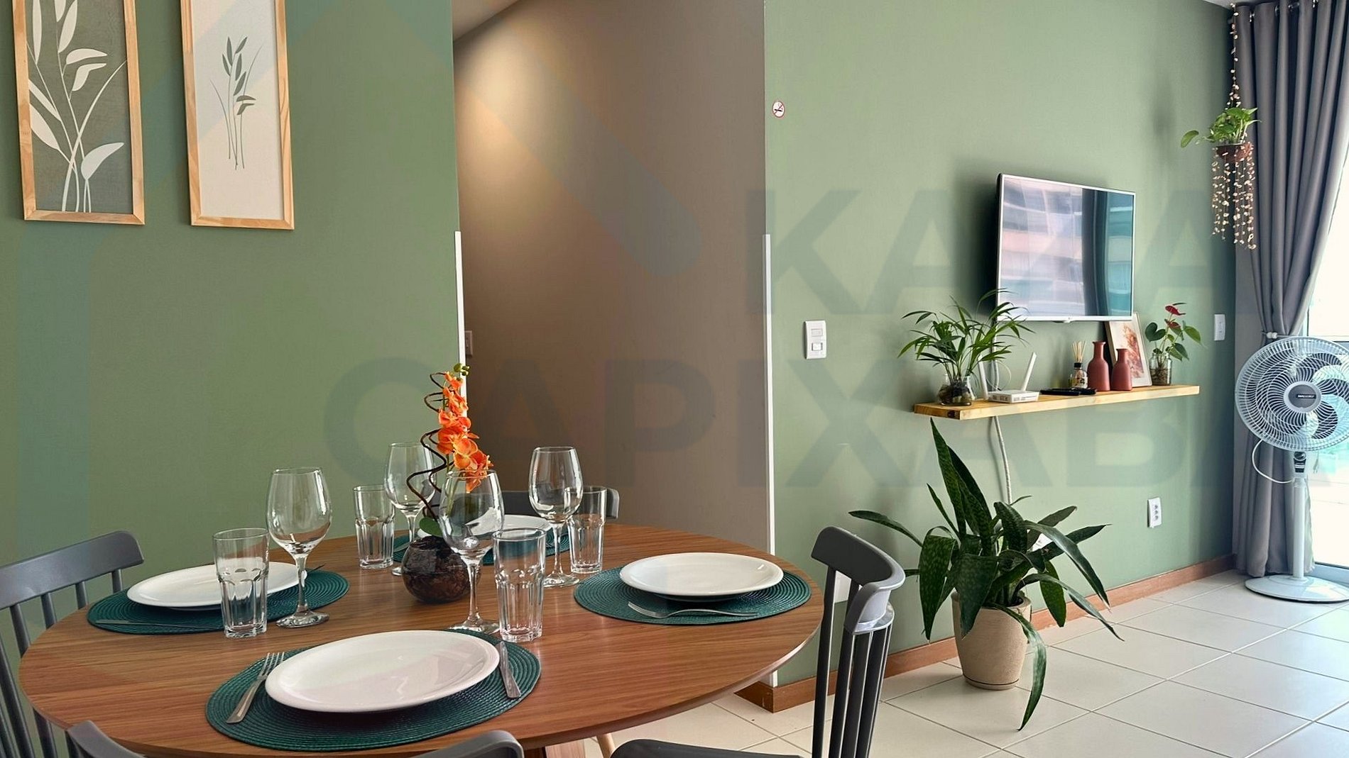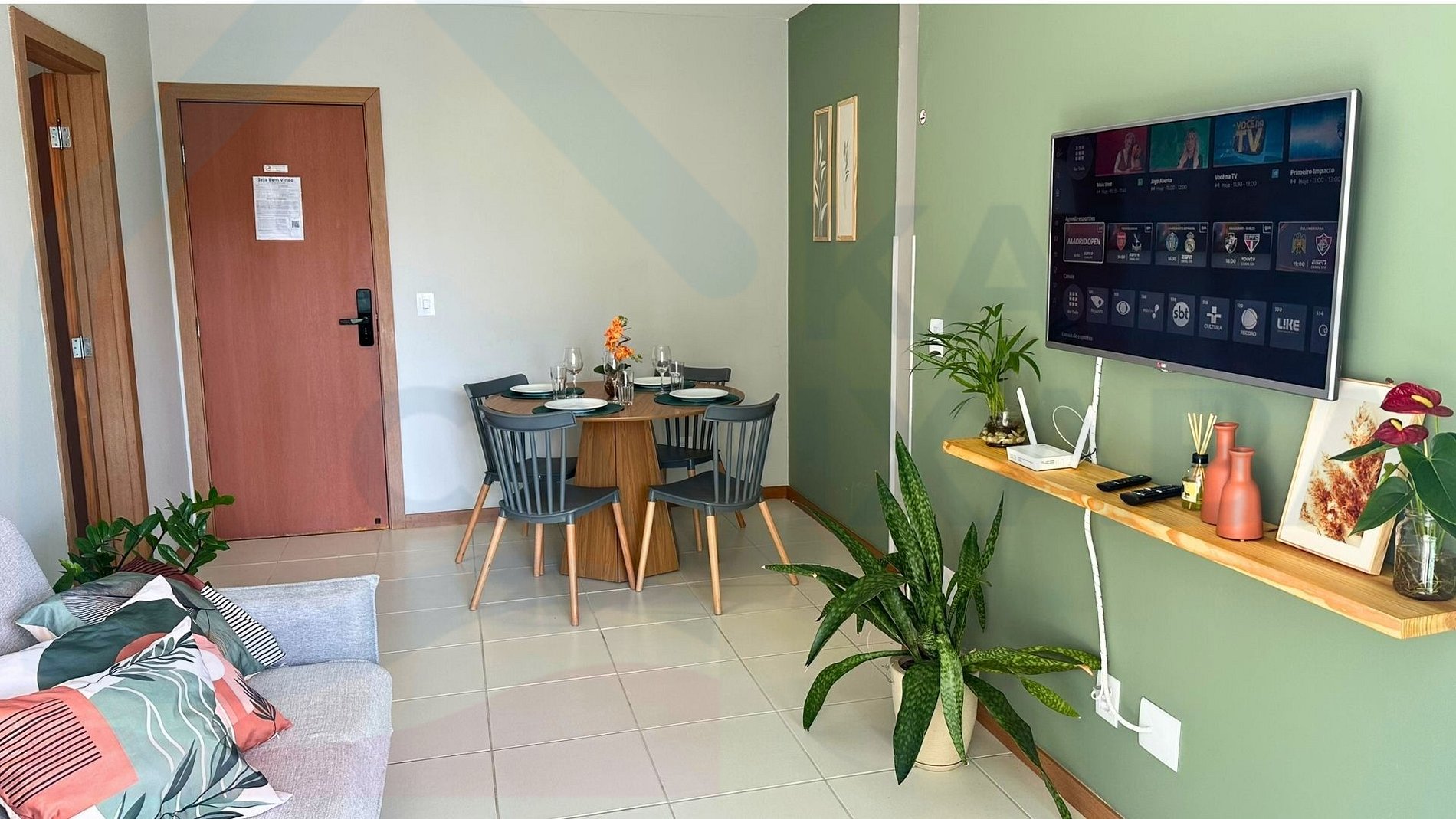 Ambiente confortável, com sofá-cama de 1,90m fechado e 1,90m x 1,20m quando aberto, ideal para acomodar hóspedes extras. Conta ainda com SmarTV de 50" (acesso a streaming logados na ClaroTV+ com uma variedade de canais por assinatura, MAX e Globoplay e mesa de jantar com 6 lugares. Para reservas com 5 pessoas ou mais, fornecemos roupa de cama adicional. Oferecemos conexão WiFi de 700Mbps.
