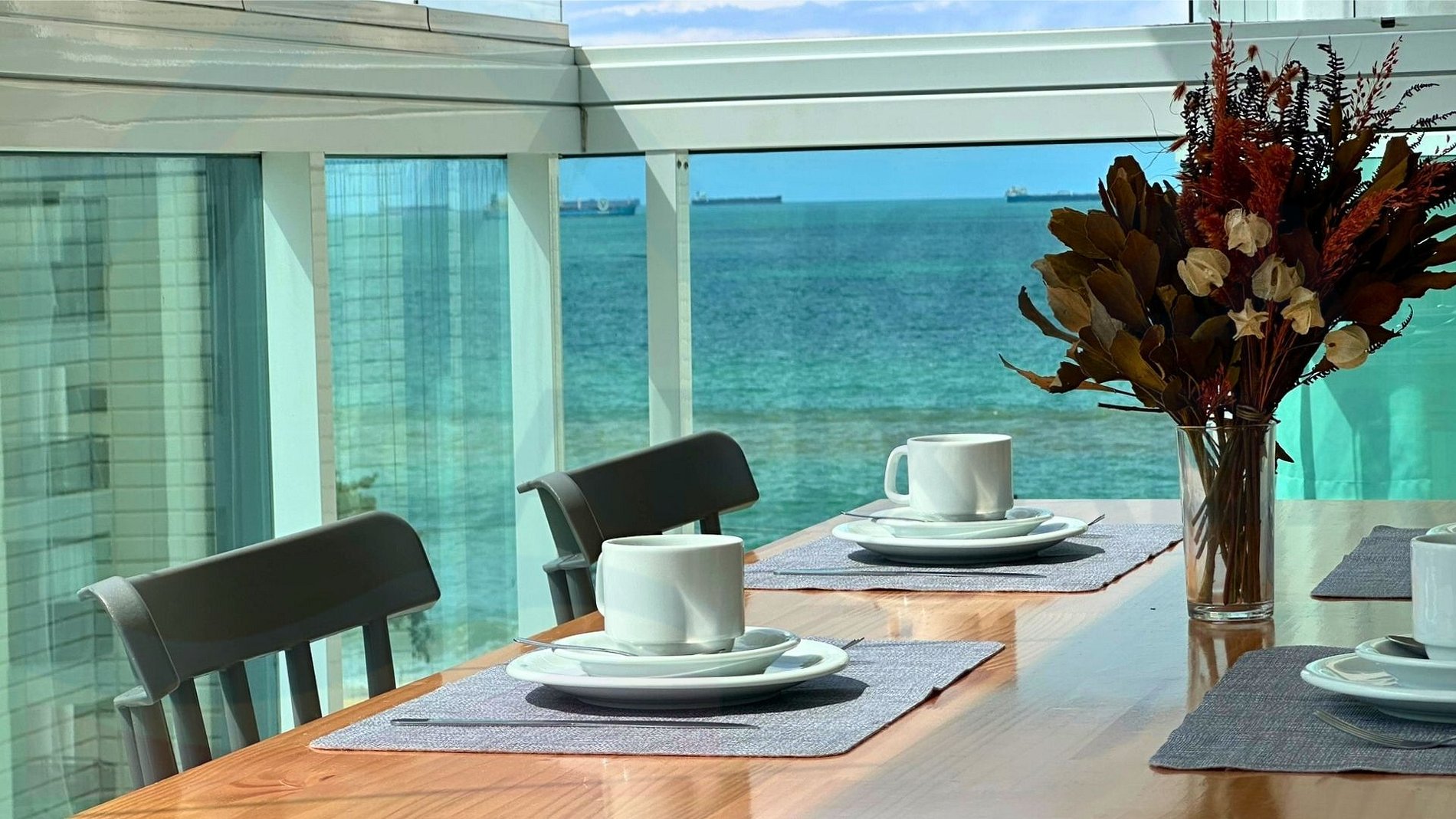 Ampla varanda com fechamento em cortina de vidro, mesa com 6 lugares e vista da Praia de Itaparica.