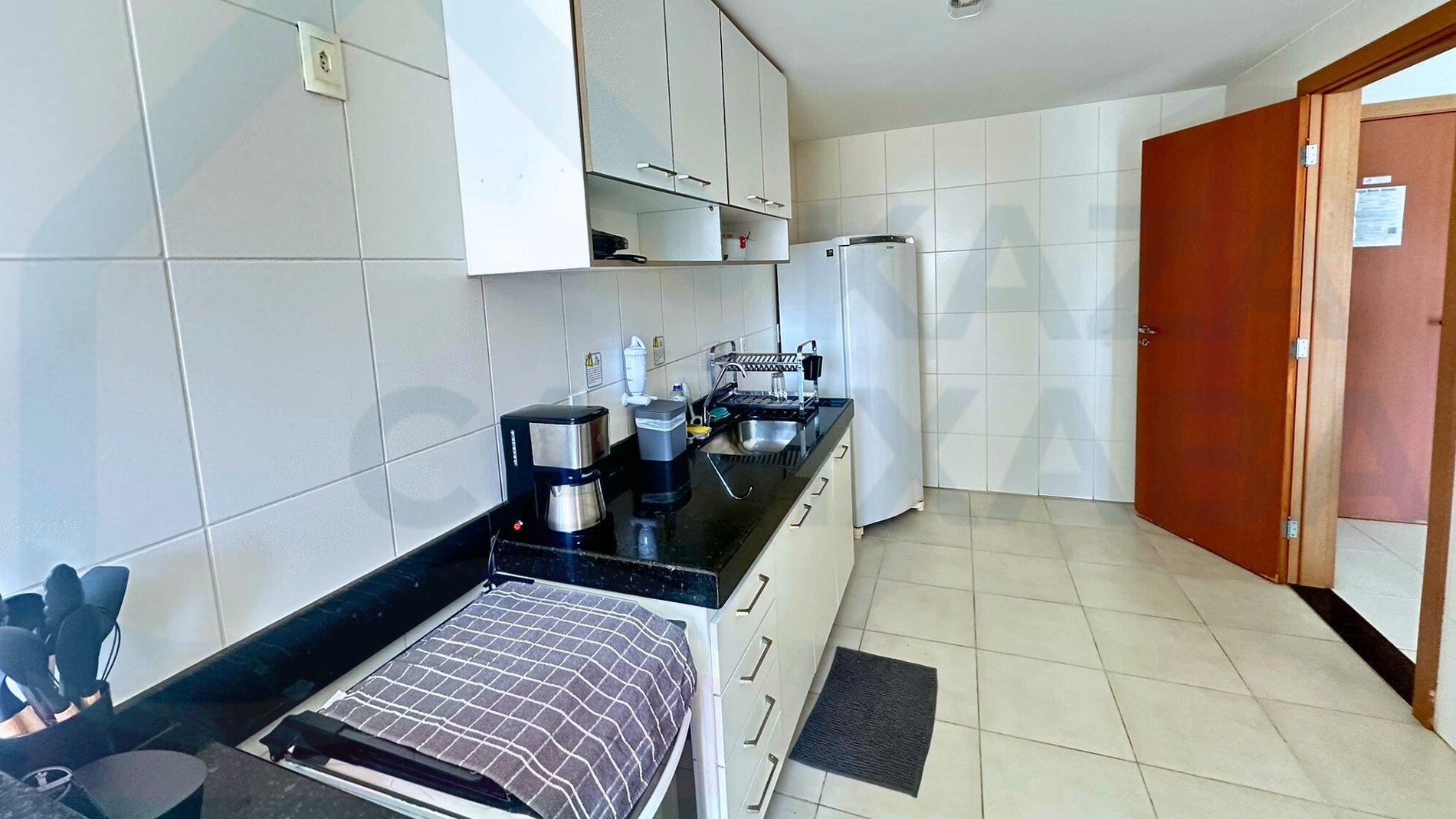 - Cozinha equipada A cozinha oferece todos os utensílios e eletrodomésticos necessários para preparar suas refeições com praticidade: fogão, forno, micro-ondas, geladeira, liquidificador, sanduicheira, cafeteira elétrica, talheres, pratos, copos, taças para vinho e jogo de panelas. Além disso, o apartamento dispõe de ferro de passar, secador de cabelo e varal, oferecendo ainda mais comodidade.