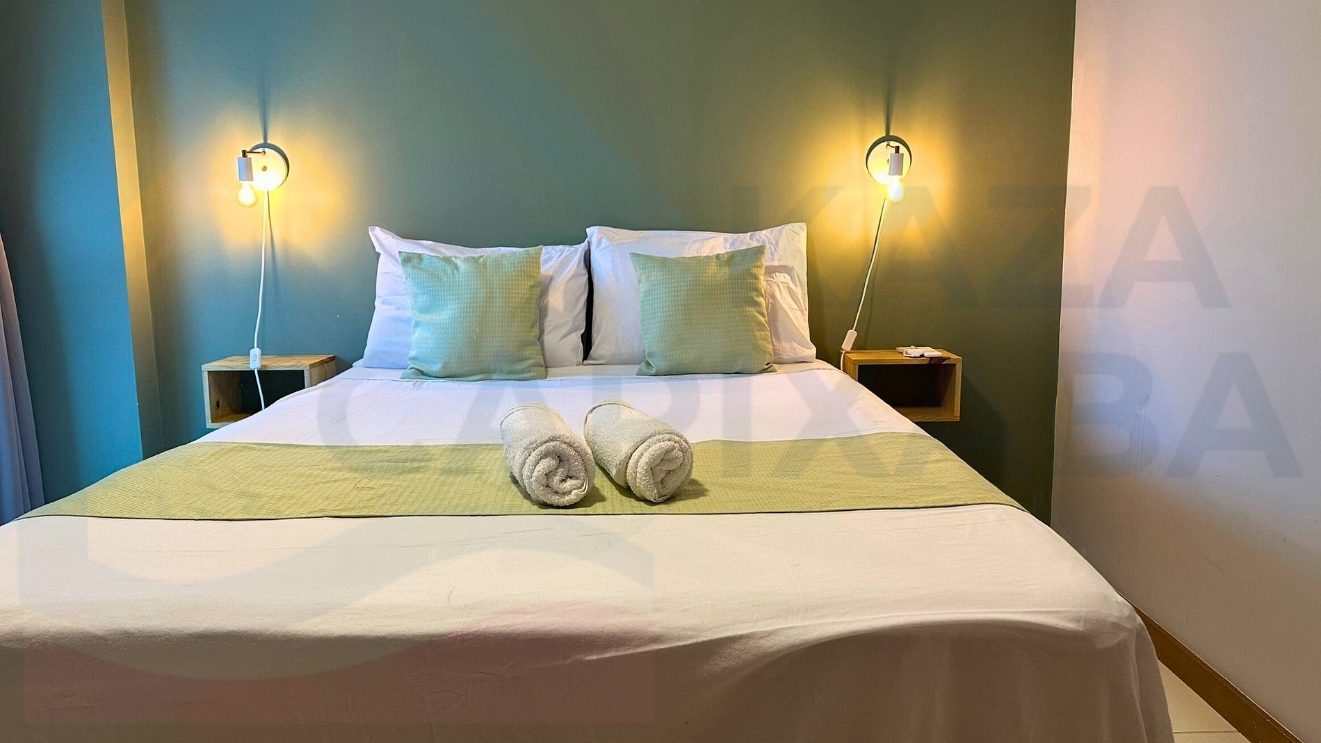 A suíte dispõe de cama de casal, ar-condicionado, ventilador de teto, cabideiro e maleiro. O banheiro privativo possui aquecimento a gás, garantindo conforto com água quente em qualquer época do ano. Roupas de cama e banho são fornecidas.